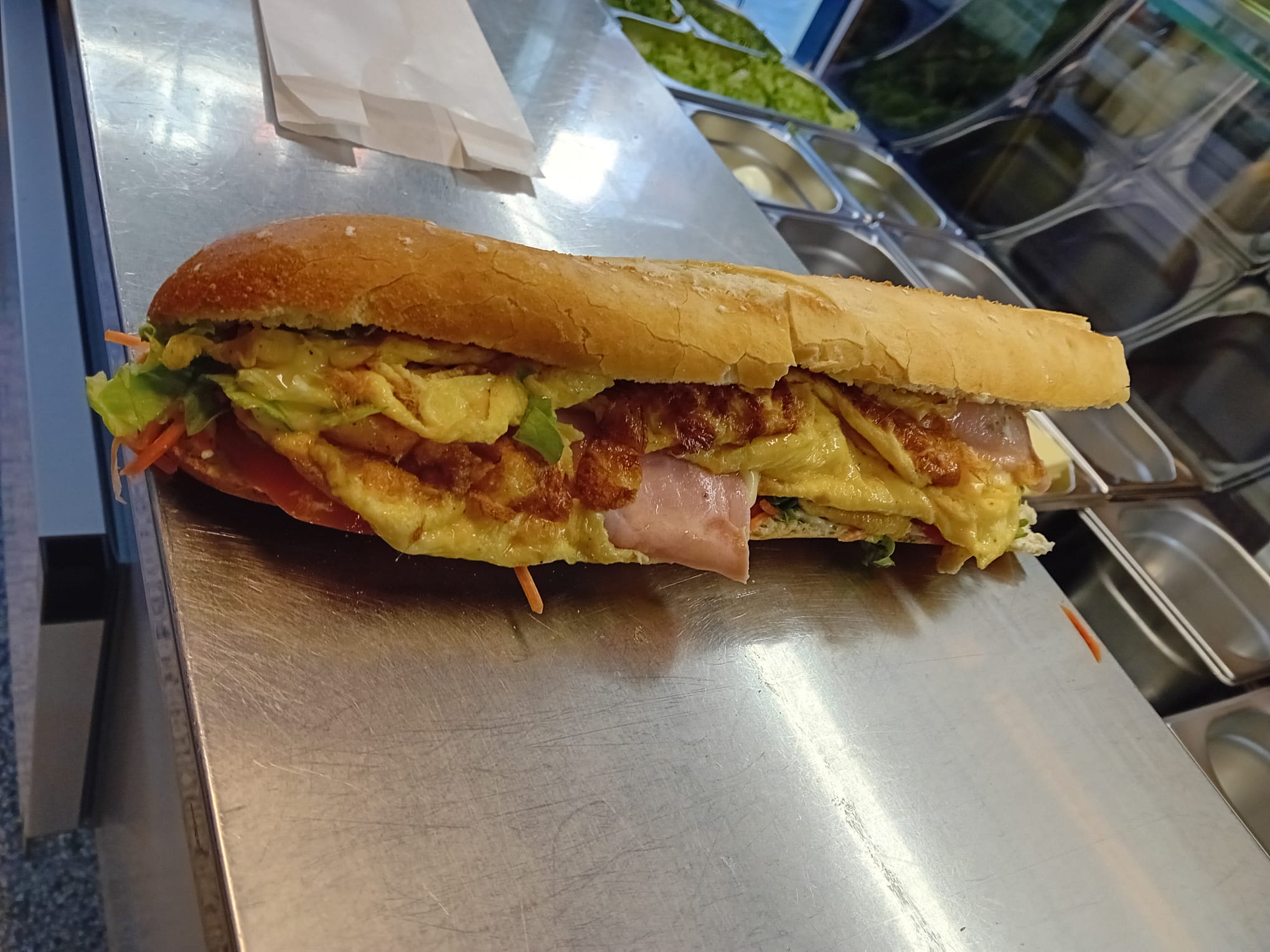 Nature ou garnie de jambon, de fromage ou des deux, pour un sandwich simple, moelleux et gourmand. Garni de sauce mayo-persillée, tomate carotte et de salade.